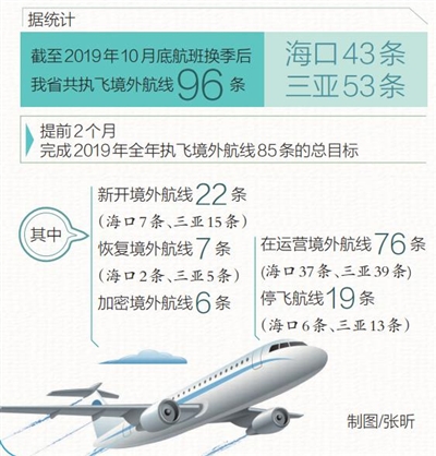 据统计,截至2019年10月底航班换季后我省共执飞境外航线96条,提前2个月完成2019年全年执飞境外航线85条的总目标。