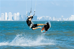 ④风筝冲浪爱好者在海口西海岸冲浪。