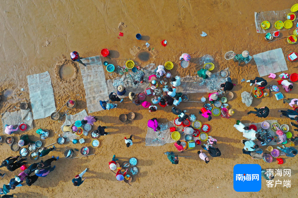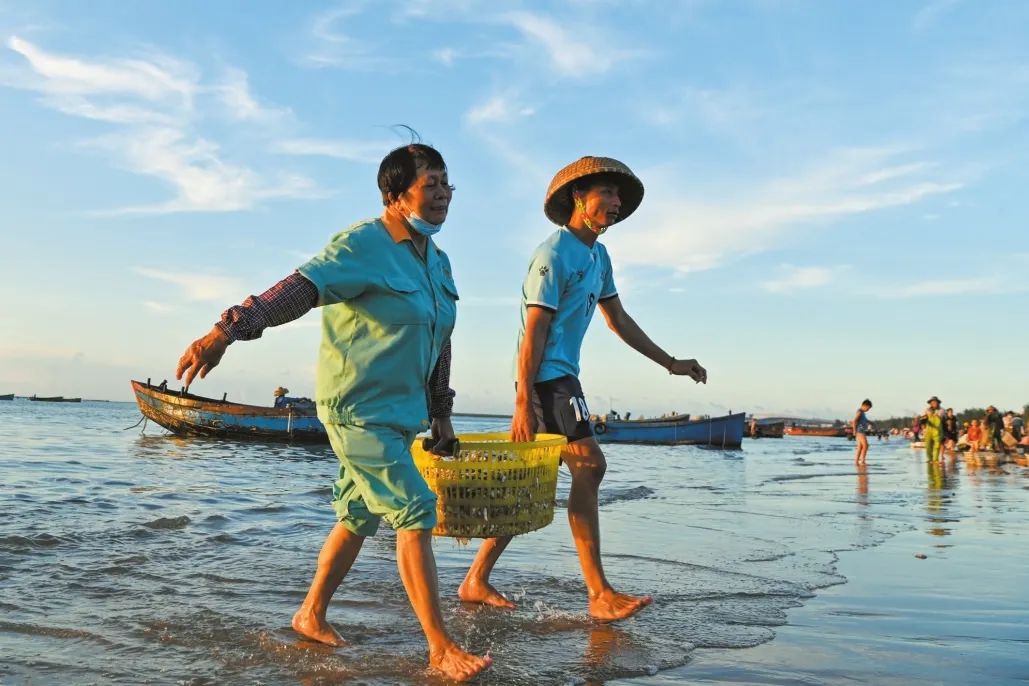 在荣山寮村,渔民出海后满载而归,正将满筐海鲜搬回海滩上供市民游客选购。
