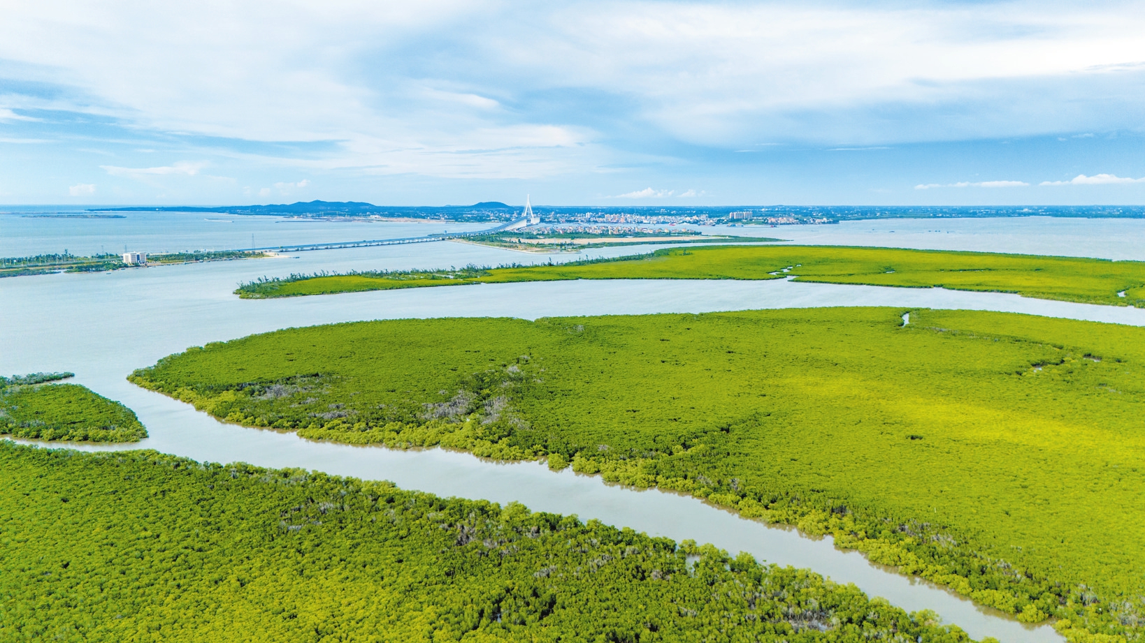 航拍视角下,海南东寨港国家级自然保护区水清、岸绿、天蓝,生态环境优美。本报记者 苏弼坤 摄