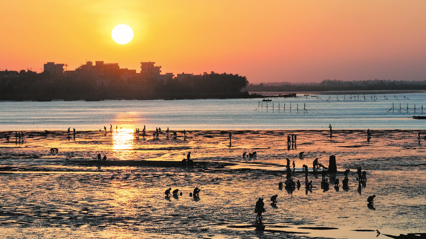 在演丰镇北港岛,朝阳将滩涂染成金色,游客手提小桶、脚踩滩涂,弯腰拾捡蛏子蛤蜊,勾勒出一幅生动的赶海画卷。 本报记者 康登淋 摄