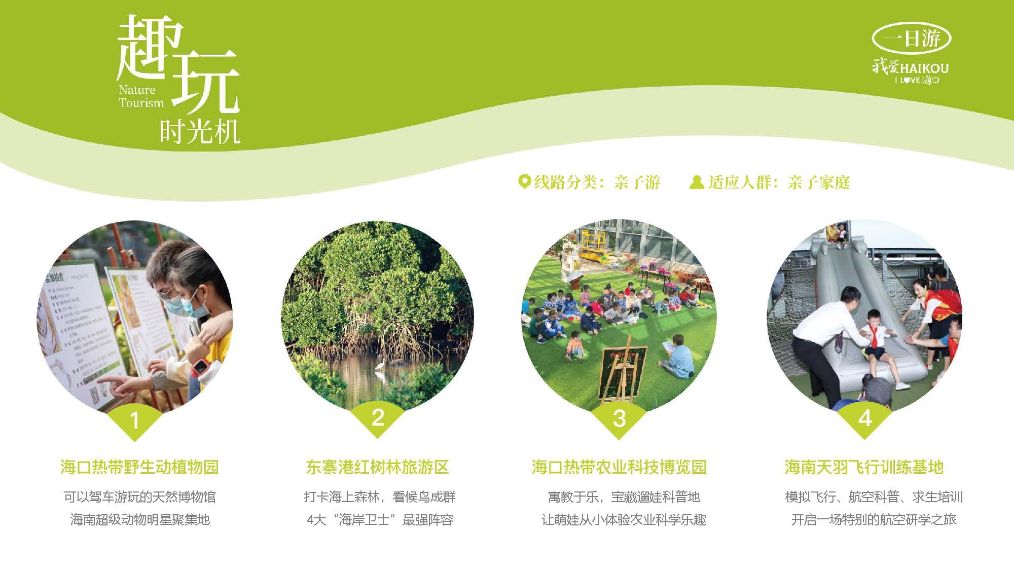 每个家庭的出游,满足孩子的需求总是第一位的,而此次海口市推出的“青葱”一日游路线,则针对亲子游家庭设置了海南热带野生动植物园、东寨港红树林、海口热带农业科技博览园、海南天羽飞行训练基地等景点景区。从而让参与其中的亲子游家庭,在感受自然、观赏动植物的同时,参与到航空科普当中,体验接近于真实的模拟飞行。