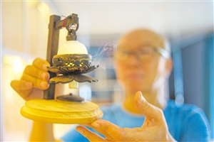 在大致坡镇美贴村,椰雕工艺师朱凡展示他打造的椰雕香炉。 本报记者 陈长宇 摄