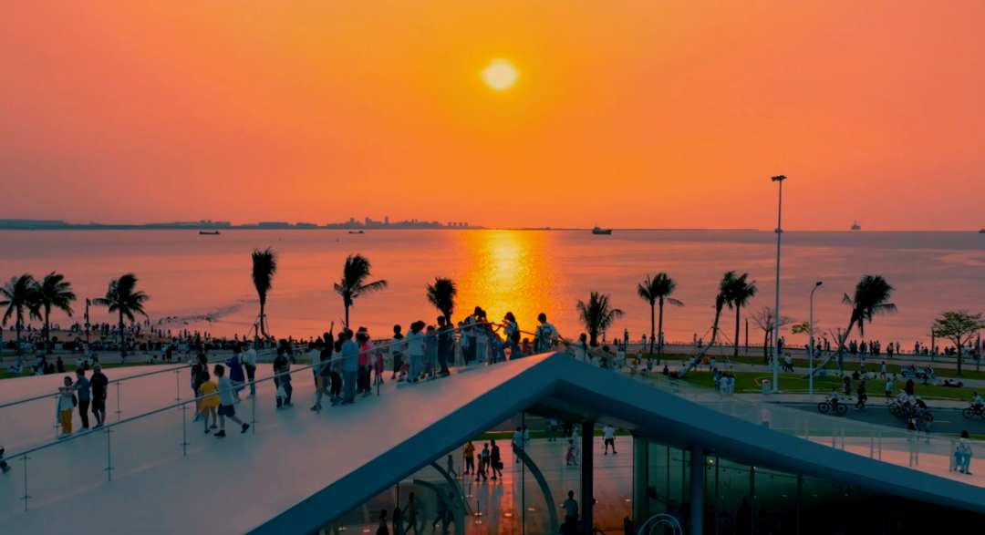 天空之山驿站成为了海口新晋地标,不少市民游客慕名而来参观游玩。宽阔的沙滩,延绵起伏的圆环屋顶,以及由圆环建筑围合的草地活动空间。游客不但可以进入其中体验高品质的慢生活,还能沿着起伏的屋面,行走在建筑上方,饱览海岸线风景,欣赏落日余晖。