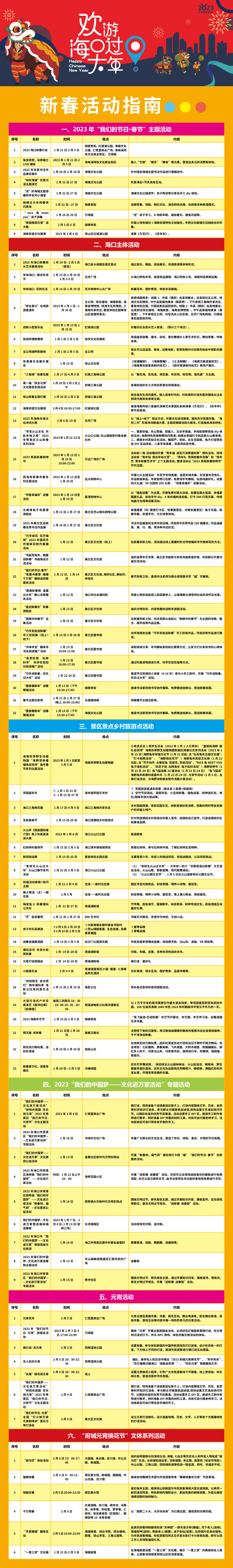 时序更替,华章日新。“琼台复兴”全域旅游直通车、五公祠湖畔影剧场、秀英新春购物节……1月份以来,海口市各区推出的2023“我们的节日·春节”“我们的节日·元宵节”等数十场不同主题活动陆续启幕。
