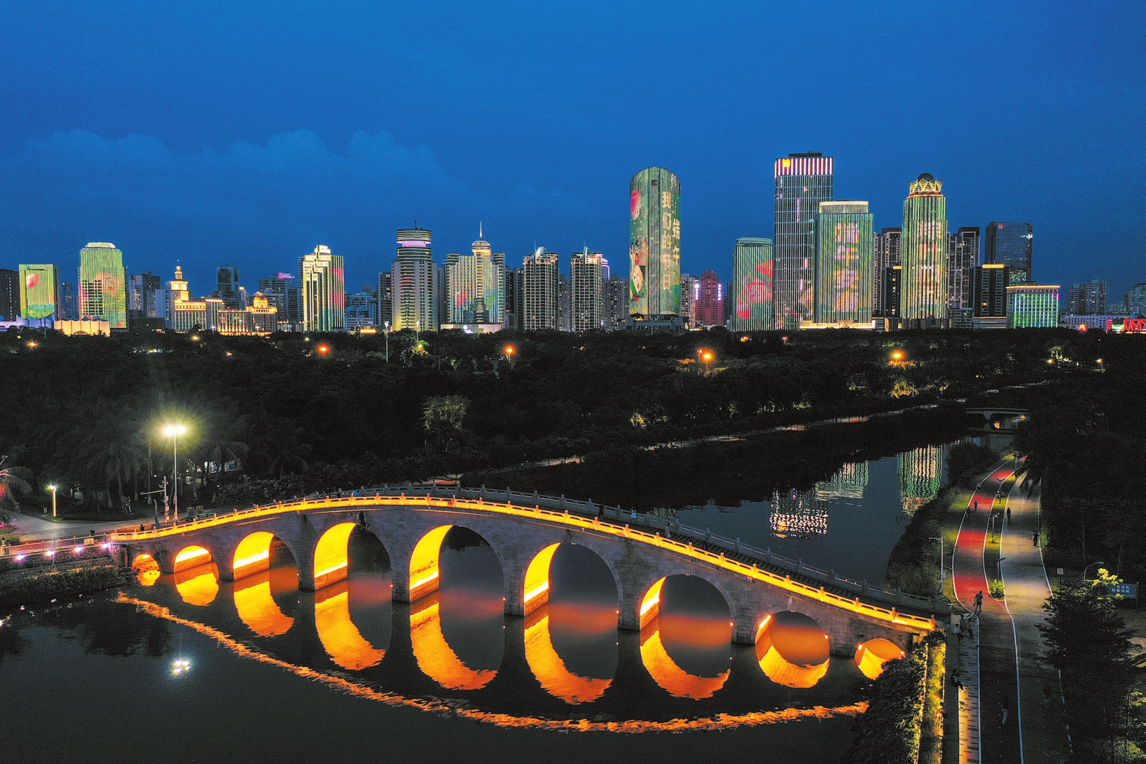 6月23日晚,海口市滨海大道楼宇灯光璀璨、景色迷人,鳞次栉比的沿路楼体展出了端午祝福相关的灯光秀,营造出热闹祥和的氛围。本报记者 石中华 摄