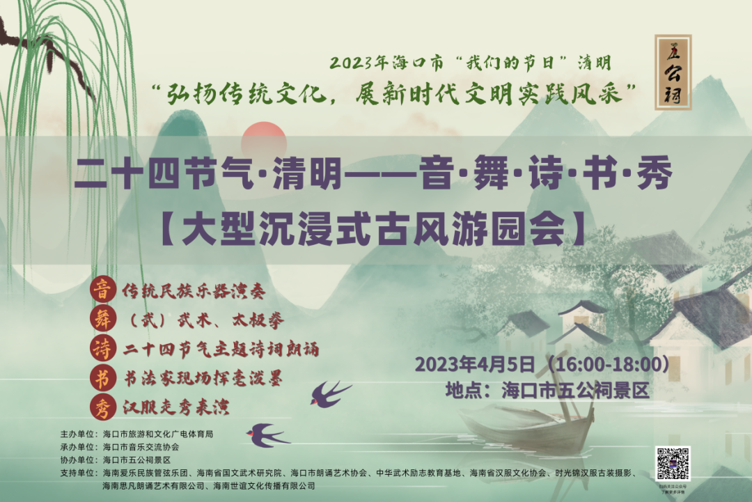 2023年海口市“我们的节日”系列活动,“弘扬传统文化,展新时代文明实践风采”,二十四节气·清明——音·舞·诗·书·秀.大型沉浸式古风游园会将于4月5日下午16:00-18:00在五公祠景区举办.