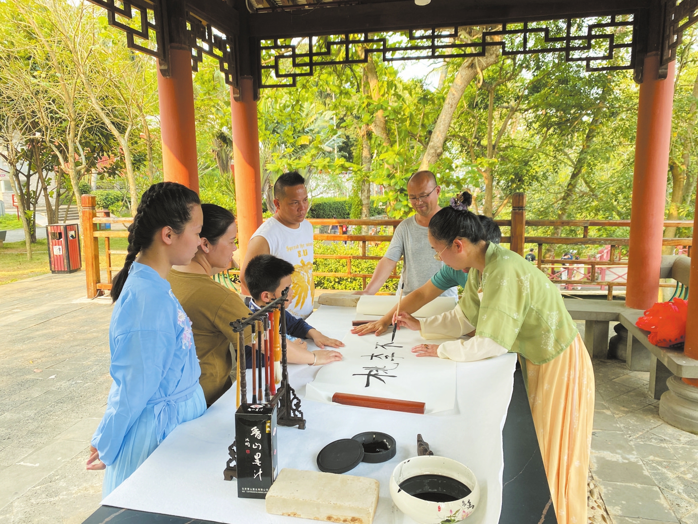 今年清明节当天,红墙青瓦、富有文化底蕴的海口五公祠迎来了一场别开生面的文化盛宴。百余名表演者身着古装,再现古代人“踏青游春”“吟诗作对”“舞拳弄掌”“琴瑟和鸣”“挥毫泼墨”“汉服游园”等形式多样民间文化体验项目,市民游客仿佛穿越了一般,开启了一段沉浸式体验清明传统文化之旅……