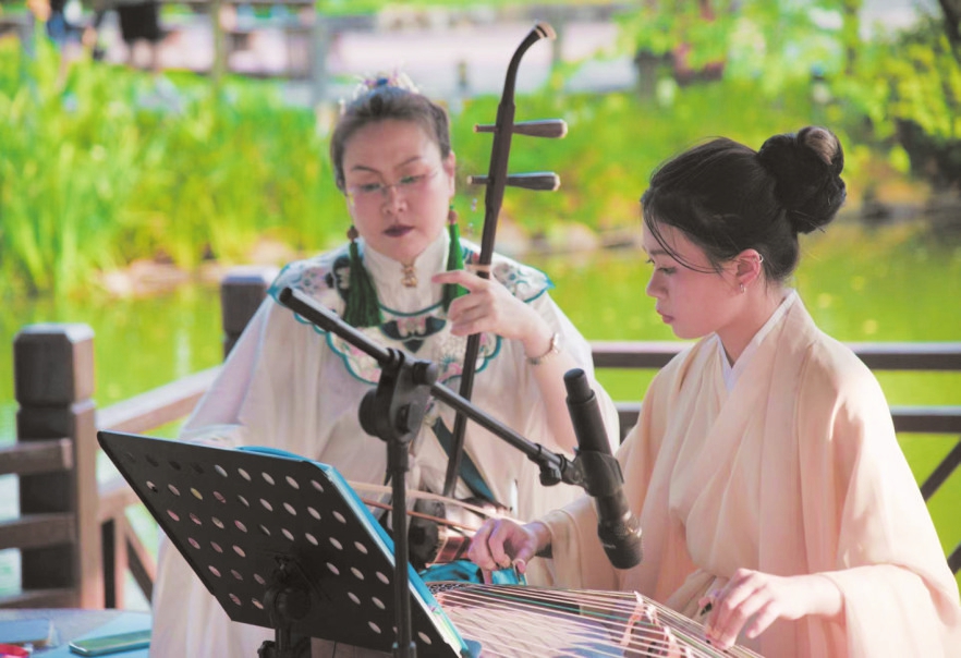 以古筝、古琴、琵琶、竹笛等传统民族乐器的演奏者置于古亭中,伴随着优美悦耳的音乐,海南爱乐民族管弦乐团倾情演奏的经典的中国传统民族音乐回响在整个五公祠内,余音绕梁。
