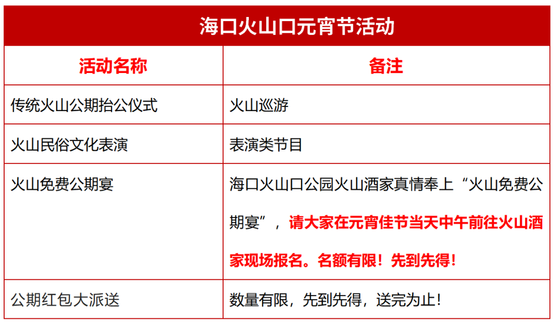 今年元宵佳节,市民游客可以在海口火山口公园游园、祈福、观看“火山公期抬公仪式”、参加火山公期宴会等多项活动,感受这里隆重的节日氛围。