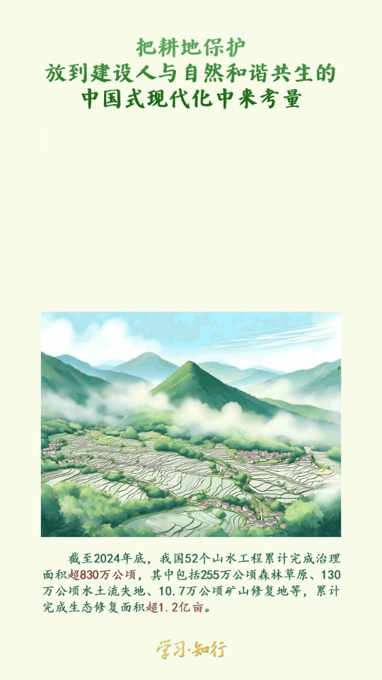 “耕地是粮食生产的命根子,是中华民族永续发展的根基。”习近平总书记站在中华民族永续发展的战略高度,对保护耕地、节约资源、促进人与自然和谐共生等发表一系列重要讲话,作出一系列重要指示批示,部署一系列重大战略举措,为推动建设人与自然和谐共生的现代化指明方向。