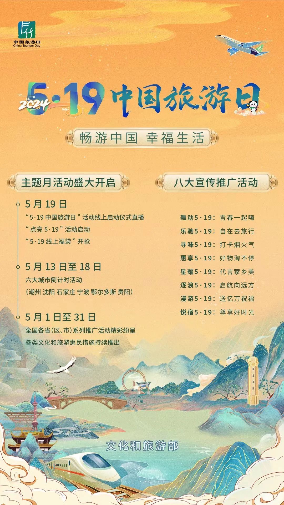 今年5月19日是第14个“中国旅游日”,文化和旅游部将以此为契机,在整个5月采用线下线上相结合的方式,以“主题月、主题周、主题日”形式开展一系列宣传推广活动,进一步提振旅游从业者信心,激发旅游市场消费潜力,促进文化和旅游市场快速恢复和发展,实现全民共享“5·19中国旅游日”。这是文化和旅游部坚持以习近平新时代中国特色社会主义思想为指导,全面贯彻落实党的二十大精神的重要举措,也是推动旅游业高质量发展,推进文化和旅游深度融合,满足人民群众幸福生活需要的具体行动。