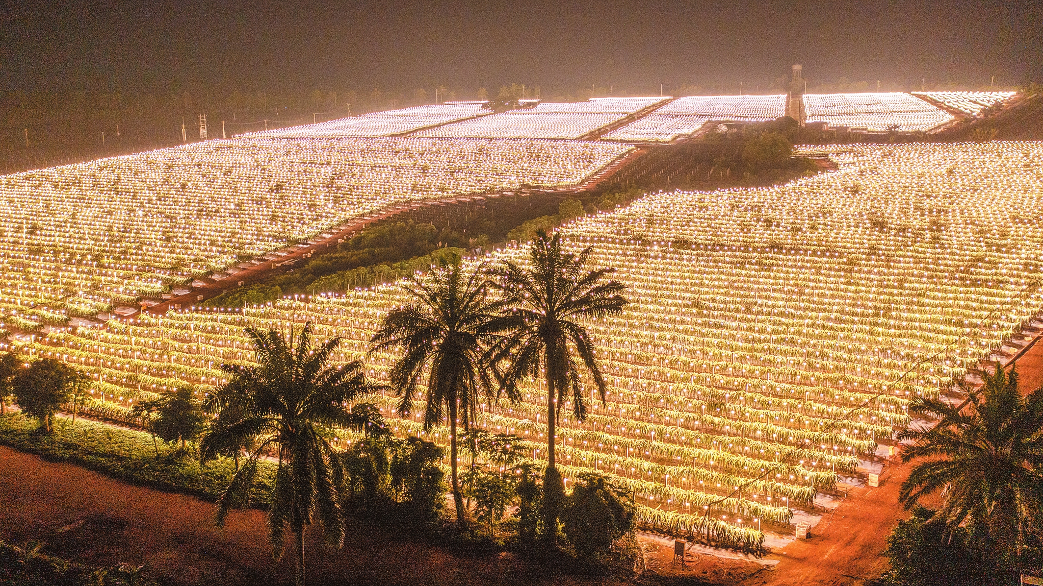 12月24日,位于秀英区东山镇的海口东山现代农业产业示范园灯光璀璨,正在为火龙果补光。每当夜幕降临,火龙果种植基地里的灯光亮起,宛如星海,蔚为壮观。