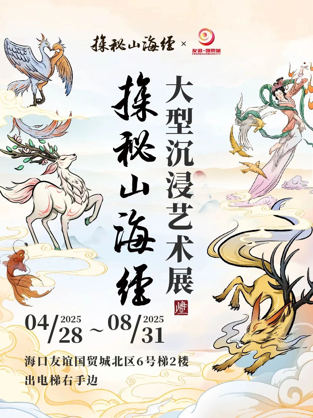 在艺术展览中,沉浸式体验先锋美学与前沿生活方式。4月28日,海南首展——“探秘山海经·大型沉浸艺术展”将在海口友谊·国贸城展出,从“精怪异兽”到“神奇草木”,从古籍残卷到光影幻境,通过原画、雕塑、装置艺术、多媒体光影等多种艺术表达方式,立体化地为市民游客呈现《山海经》中的奇妙世界。本次艺术展将持续至8月31日,可前往【海南友谊国贸城】小程序或猫眼、大麦购票观看。
