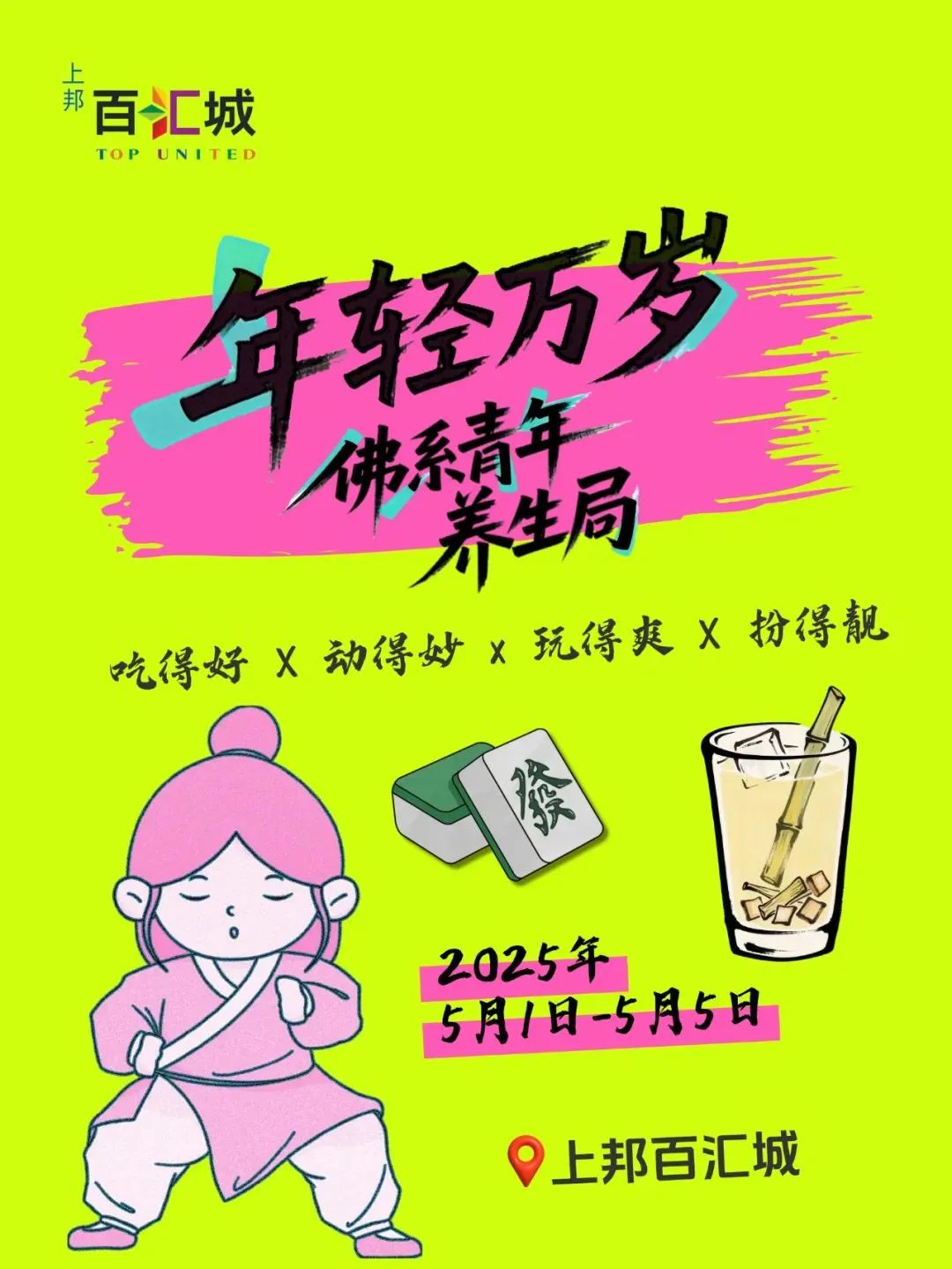 上邦百汇城推出“年轻万岁佛系青年养生局”活动,市民游客可到现场体验养生主题美陈打卡、养生市集、中医把脉义诊,免费肩颈按摩。同时,还可以参与第一届 “全城听牌”麻将大赛,赢千元现金。