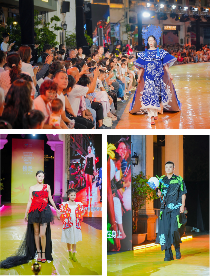 当晚8点,伴随着中式古典乐曲的悠扬旋律响起,身着立体剪纸图样服饰的模特从骑楼拱廊间缓缓走出,牡丹、龙凤等中国传统元素在轻盈的薄纱上若隐若现,椰林婆娑化作黎锦裙摆流转的曲线,传统与潮流在光影间巧妙融合。