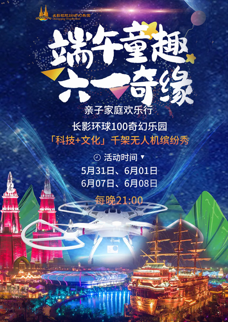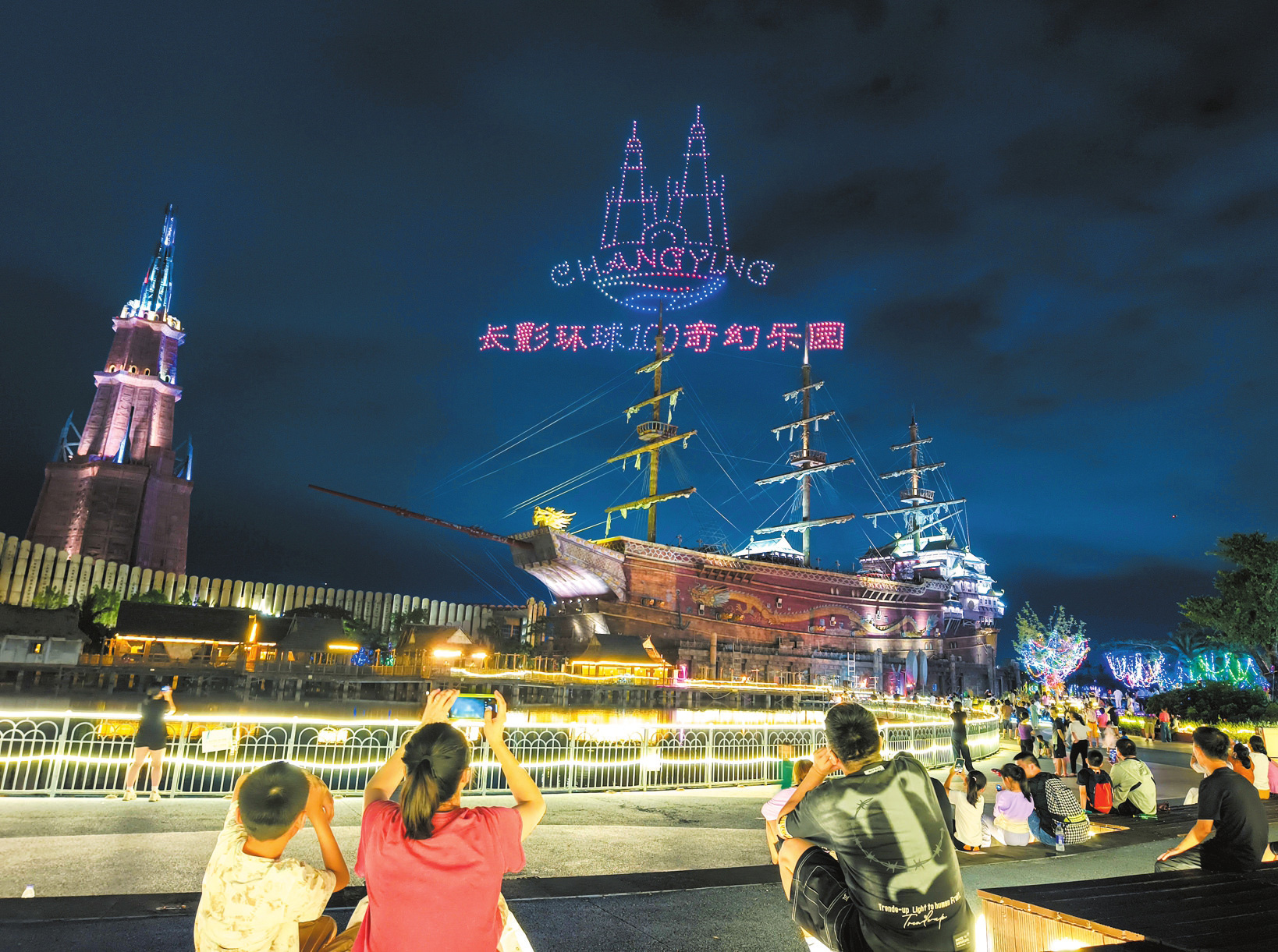 5月31日,在海口长影环球100奇幻乐园,无人机摆出的精美图案颇受市民游客青睐。本报记者石中华摄5月31日端午假期首日,海口一系列文旅活动轮番上演,点燃了整座城市的节日激情,也为海口文旅市场注入了强劲