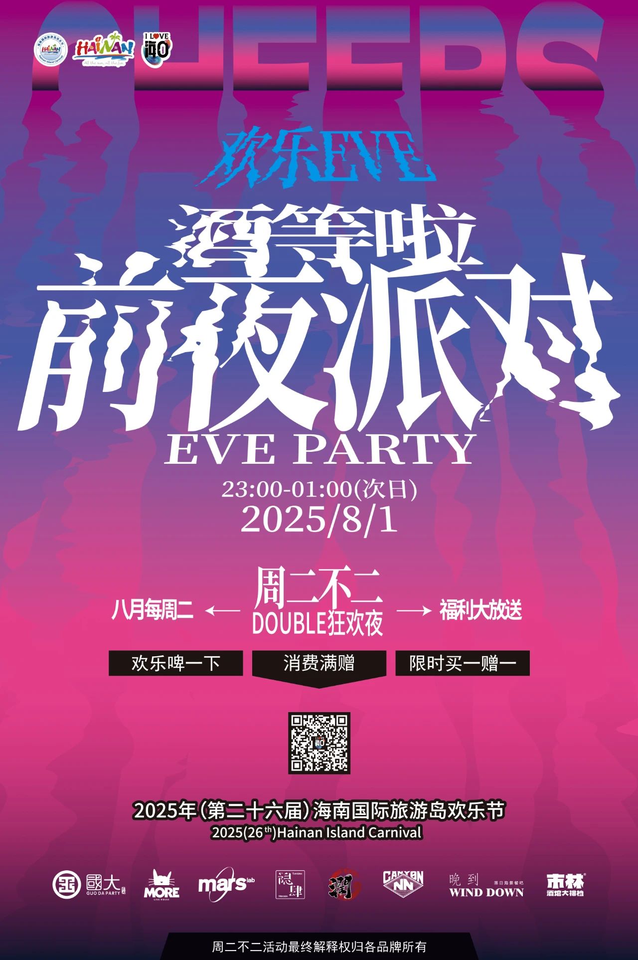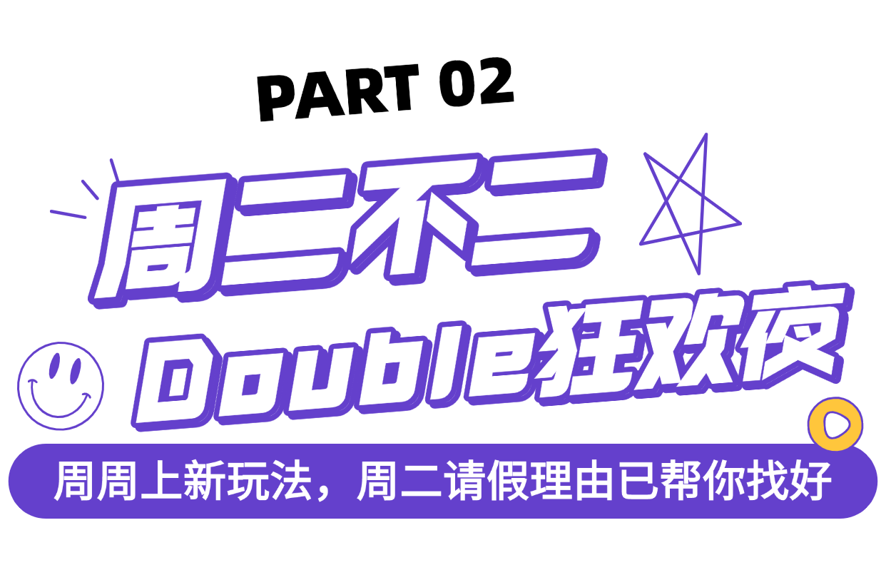 8月特别加码!每周二"Double狂欢夜"专属福利惊喜来袭:限定酒水买一送一、爆款零元购等神秘隐藏福利,周周都有新玩法,引爆全城夜生活狂欢潮!