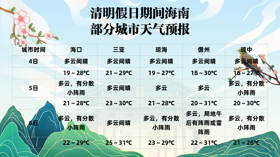 4月3日消息:据海南省气象台发布的天气预报,清明节期间海南天气总体良好,全岛以多云间晴天气为主。未来天气趋势预报(4月4日~11日)陆地方面:4日~10日,受东南气流影响,海南全岛多云间晴,其中5日~