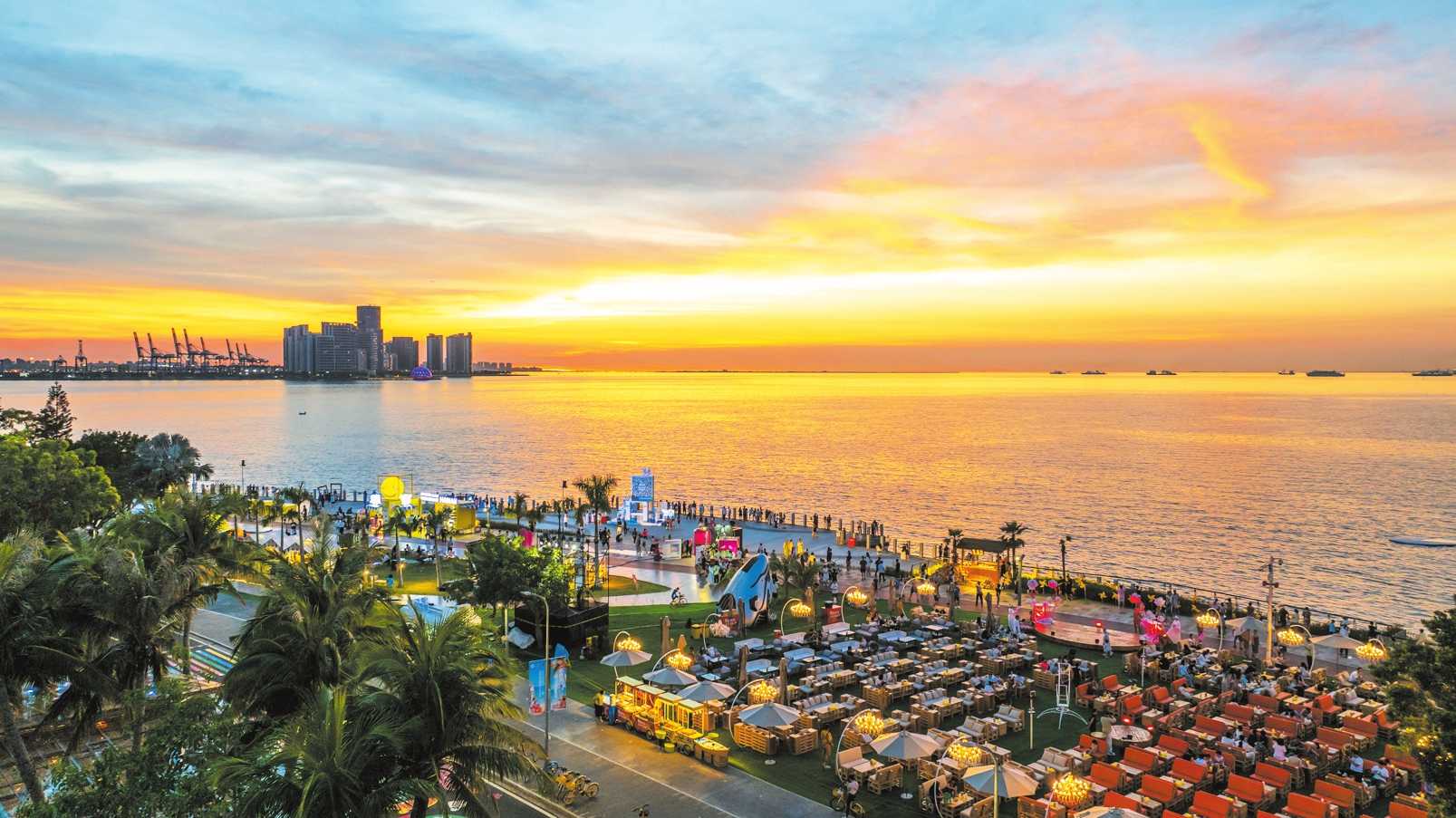 餐厅里,灶上的火一直不断厨师忙得脚不沾地打卡点旁一组拍照的市民游客还没拍完后面已经排起了翘首以待的长队海堤前,人们嬉戏玩耍在夕阳下描绘出生动的剪影……站在办公室向外看,眼前热闹的一幕幕让海口自在湾街区