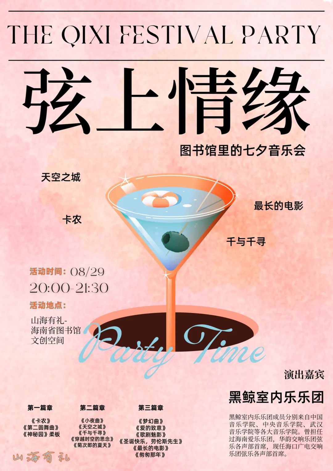 同日,“弦上情缘”图书馆里的七夕音乐会也将于山海有礼-海南省图书馆文创空间优雅奏响。黑鲸室内乐乐团将演绎多首经典曲目,在书香与琴韵交织的氛围中,为观众带来一场高雅而又温暖的心灵抚慰。