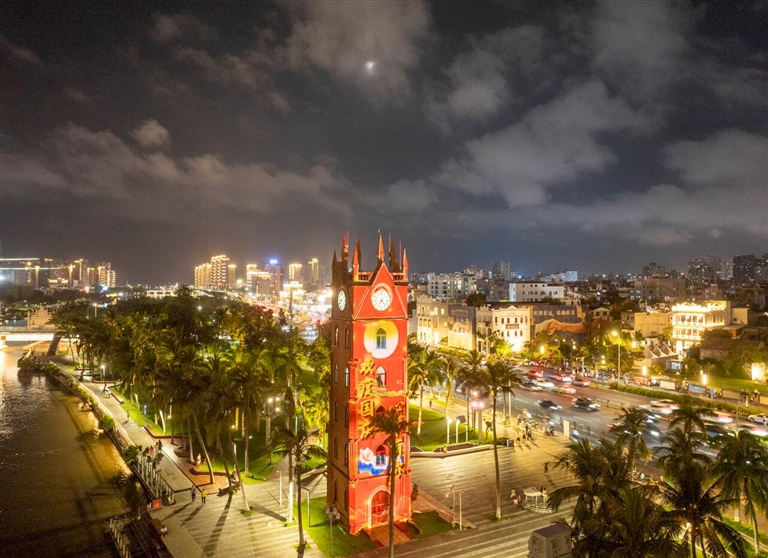 10月6日晚,随着一阵清脆的哨声,一簇烟花在儋州海花岛上腾空而起,“砰”的一声在夜空绽放出金色焰火。紧接着,上百架无人机组成的光影缓缓掠过,与烟花交织成一幅幅国庆中秋主题的画面。现场观众连连赞叹,举起手机在光影中合影。