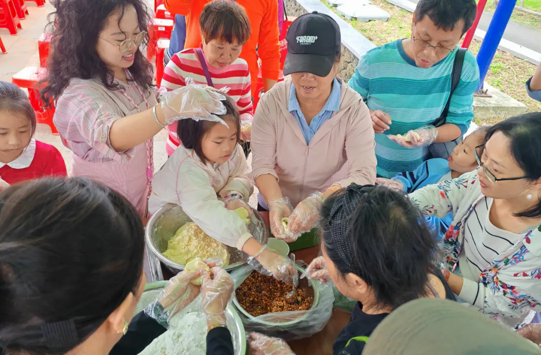 晚会正式开场前,村内早已洋溢着浓浓的节日气息。作为重阳特色互动体验,椰子糯米意粑手作活动在天后庙广场一侧率先展开,众多家庭携手参与,将本地椰香融入软糯意粑中,老少同乐,体验传统小食的制作乐趣。