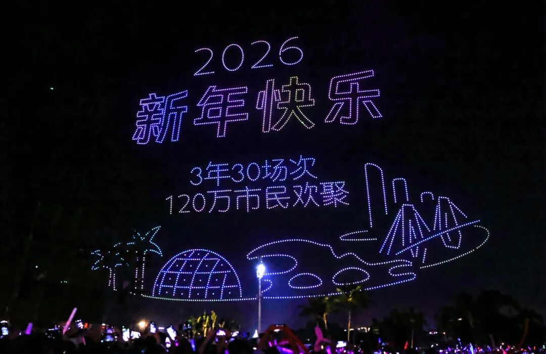 2025年12月31日晚,2025-2026“夸下海口”跨年草坪音乐会圆满收官!作为海口重要跨年活动之一,本次音乐会零点登场的无人机光影大秀惊艳全场,吸引万余名观众聚集于此,仰望这片被创意点亮的椰城夜空。