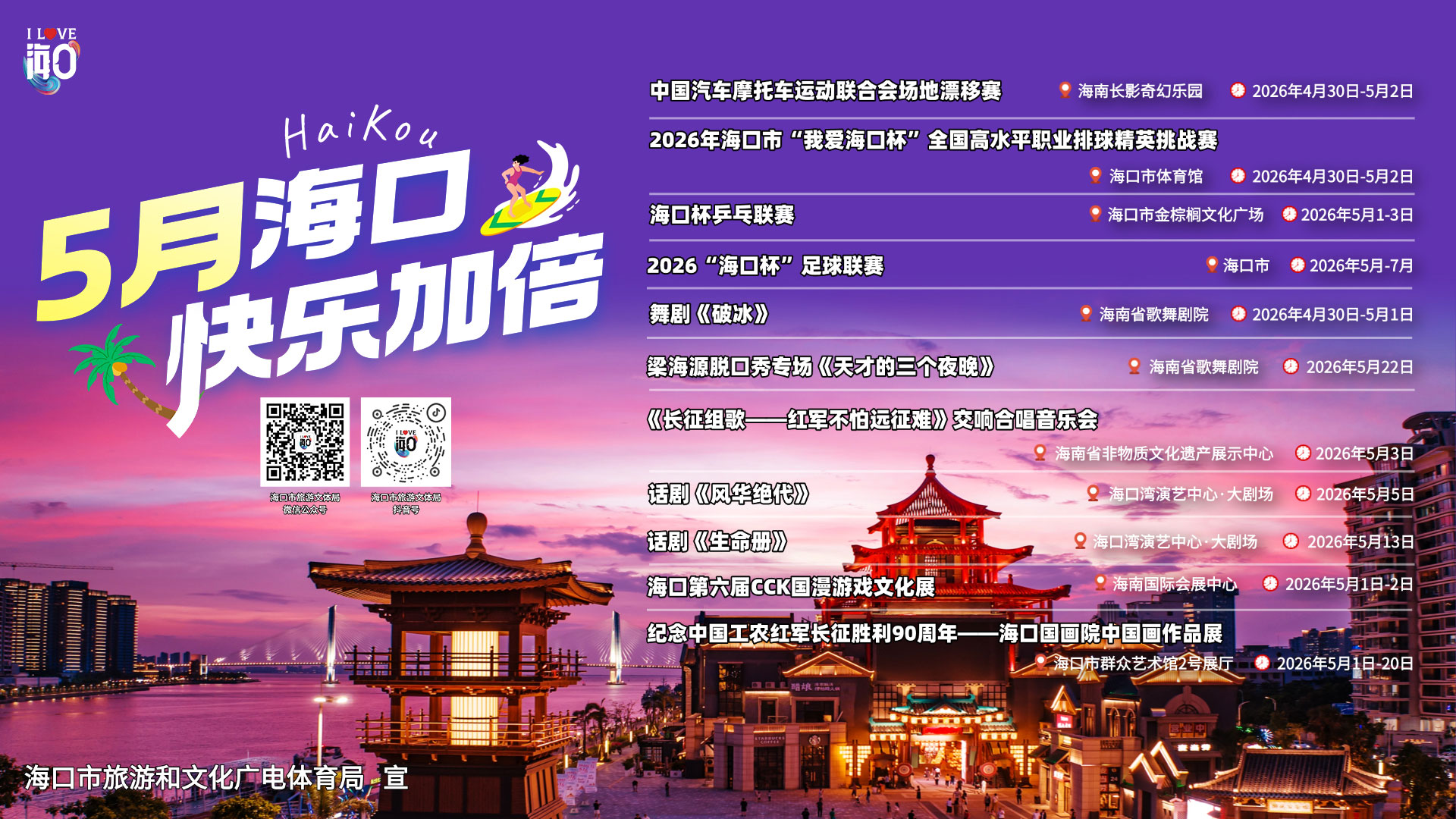 “文体大餐”已备好!“五一”来海口承包你的快乐,精品演出好戏连台,体育赛事精彩不断,今年“五一”假期依托自贸港文旅资源优势,海口将推出一系列形式多样、内涵丰富的文体活动。将传统文化、潮流演艺、体育竞技与市民游客休闲需求深度融合。