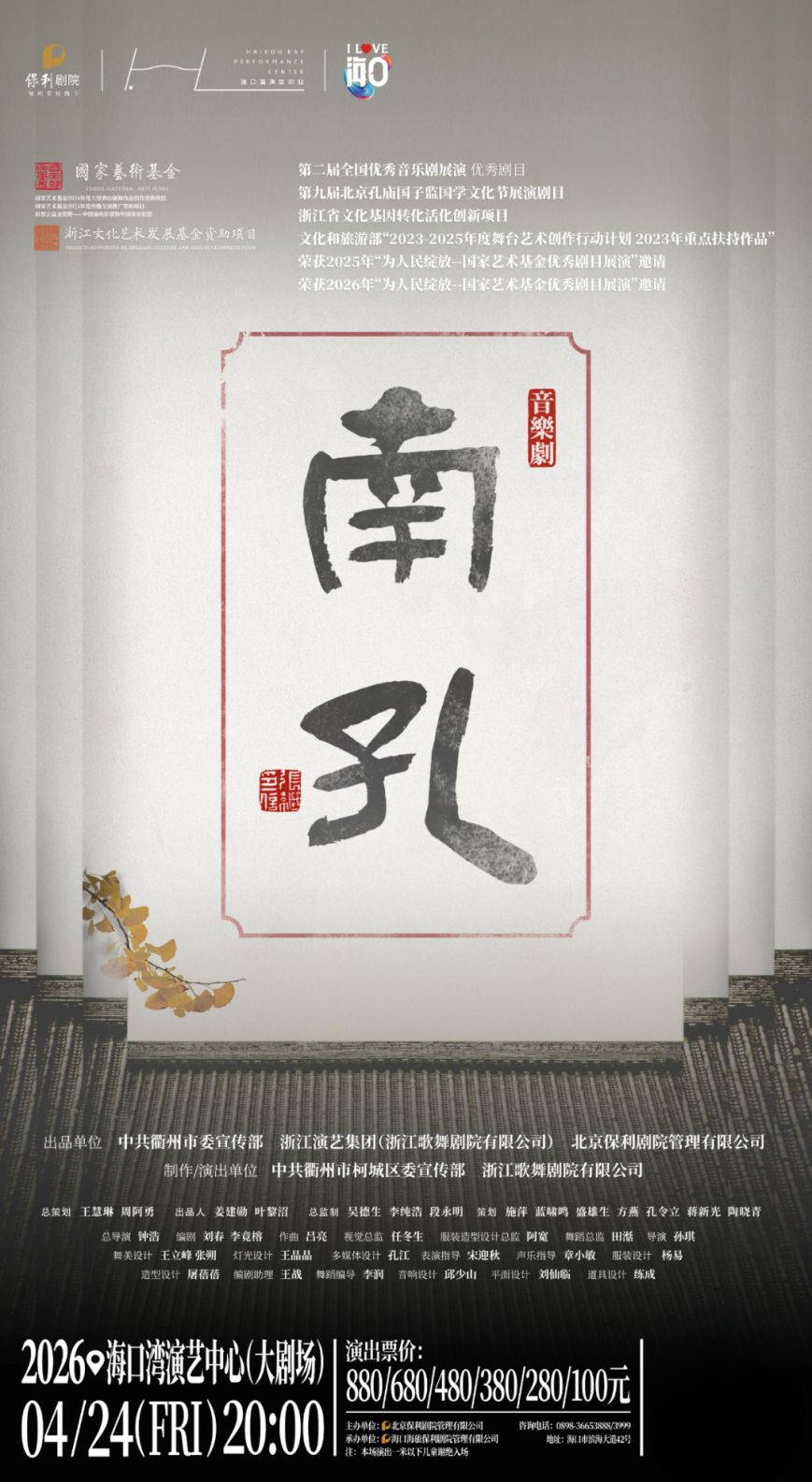 4月24日(周五)20:00,海口湾演艺中心,音乐剧《南孔》诚邀您共赴一场寻找“礼”、守护“礼”、传承“礼”的千年历程。