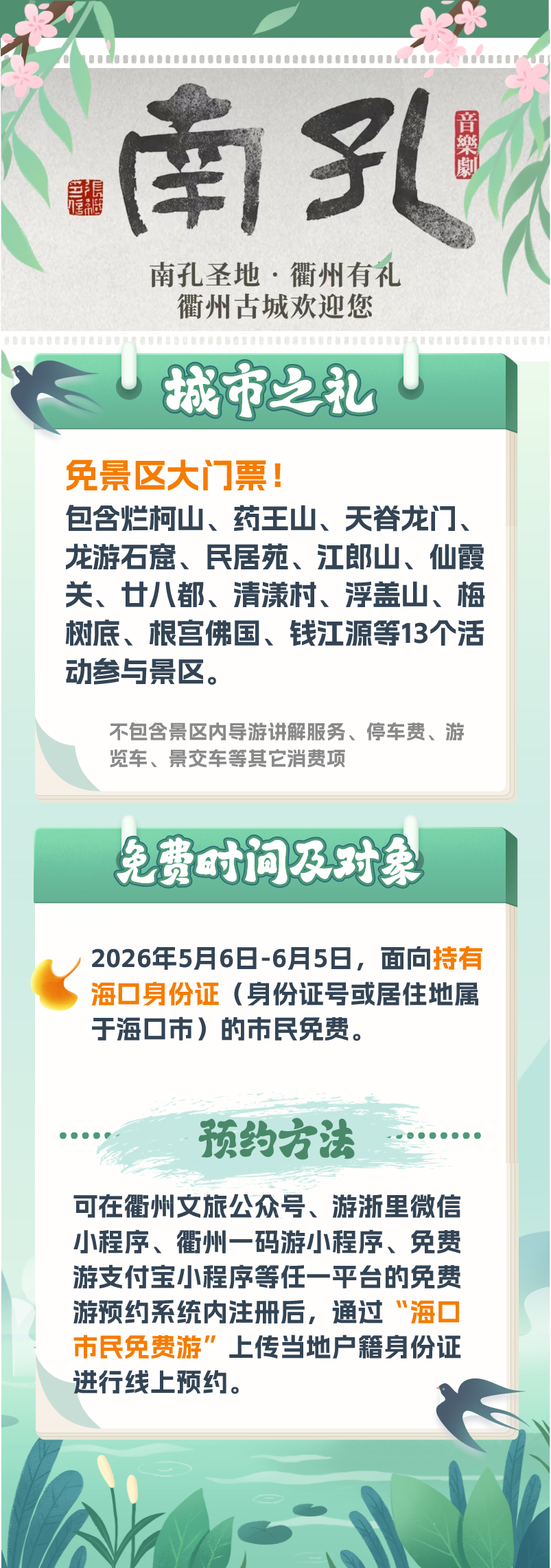 宠爱海口人,衢州也准备好了!2026年5月6日——6月5日,面向持有海口身份证(身份证号或居住地属于海口市)的市民,衢州13个核心景区将对海口人免费开放!
