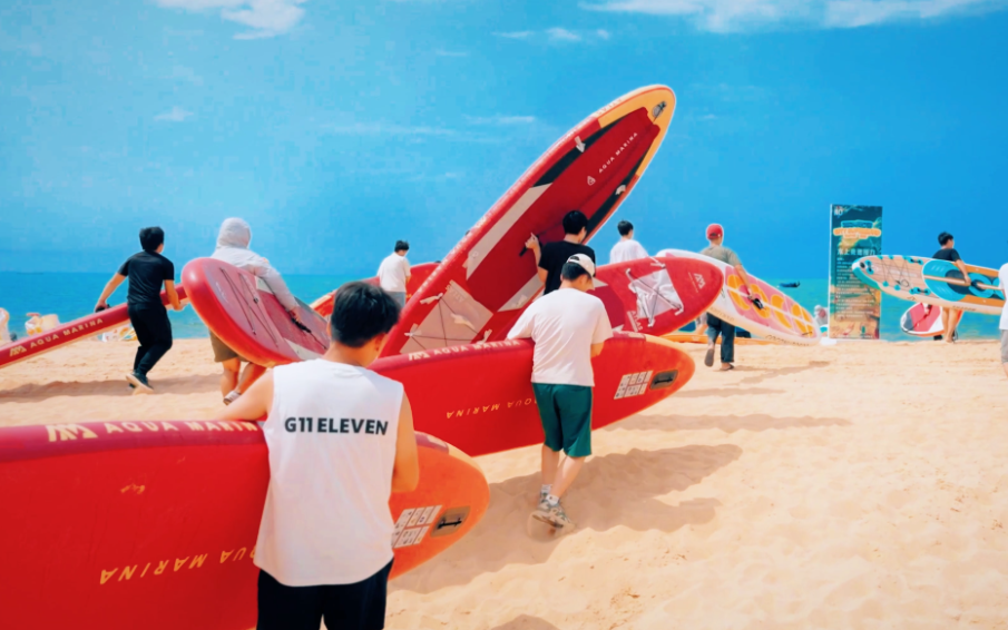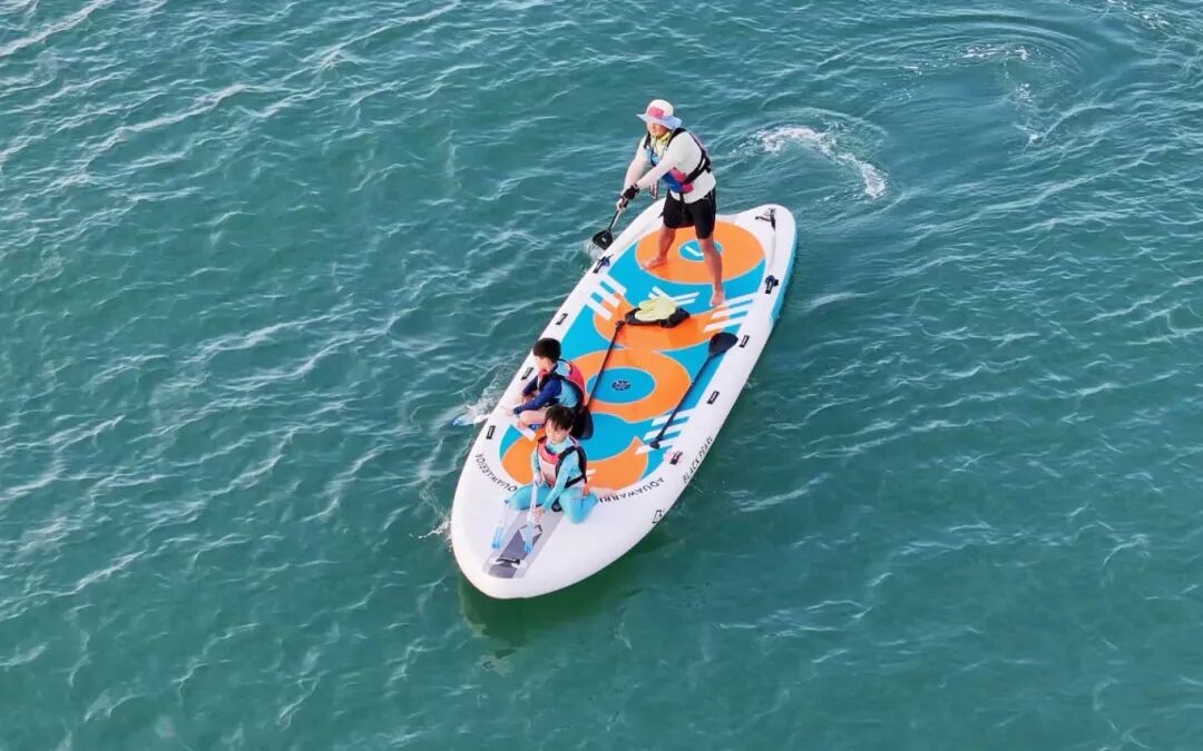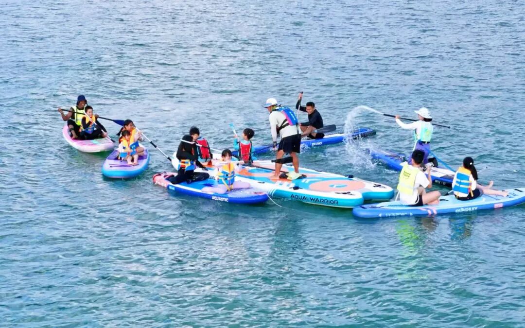傍晚时分,荣山寮的沙滩被夕阳染成金黄。孩子们踏上桨板,划入水中,在专业指导下学习平衡与划桨的技巧,享受水上运动带来的快乐。