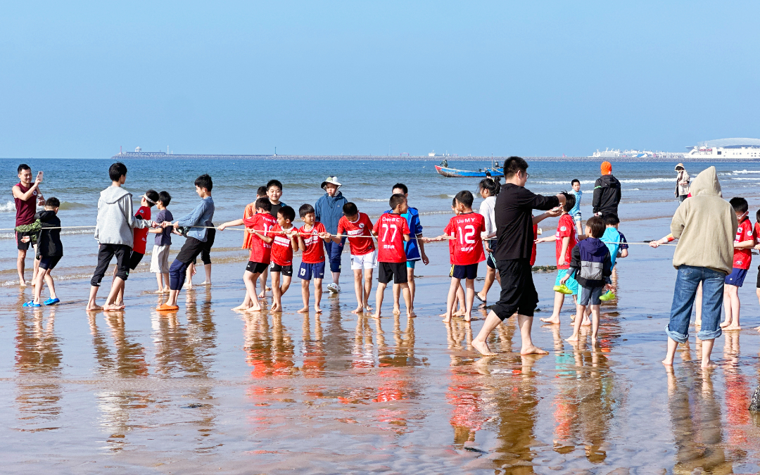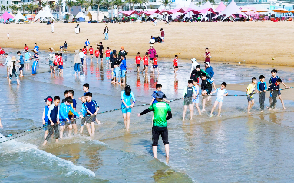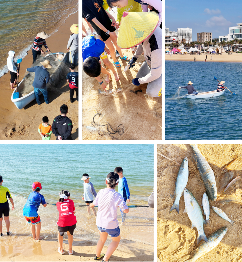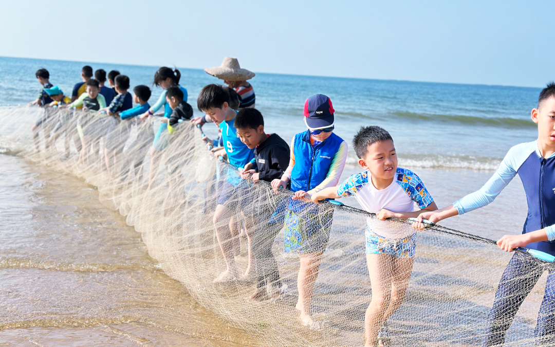 孩子们还可以认识各种海洋鱼类,学习安全捕鱼技巧;从撒网到收网,众人合力将渔网拉回岸边,共同迎接大海的馈赠。