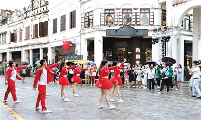 游客在海口骑楼建筑历史文化街区观看演出活动。(海口市旅文局供图)