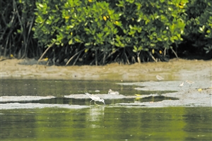 10月10日下午,退潮后的海南东寨港国家级自然保护区塔市保护站湿地内,红树林旁的滩涂露出水面,一个个白色身影从林中腾空而起,优美的身姿划过水面,这是正在觅食的大白鹭,它们有些从北方迁徙而来,有些已在这里安家筑巢。