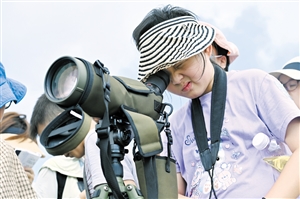 10月4日,在海南东寨港国家级自然保护区下塘湿地,小朋友使用单筒望远镜观鸟。 本报记者 石中华 摄