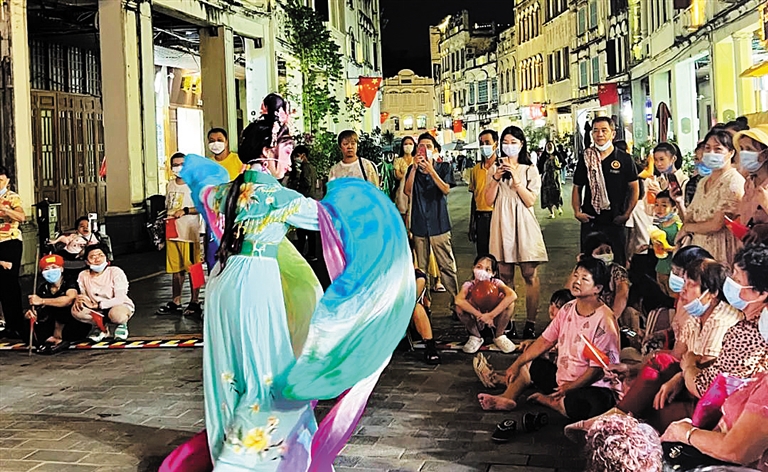 市民游客在骑楼老街观看演出。(本版图片均由海口市旅文局提供)