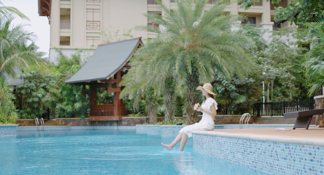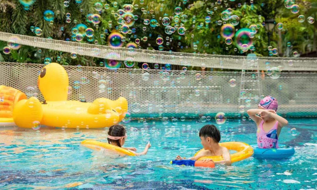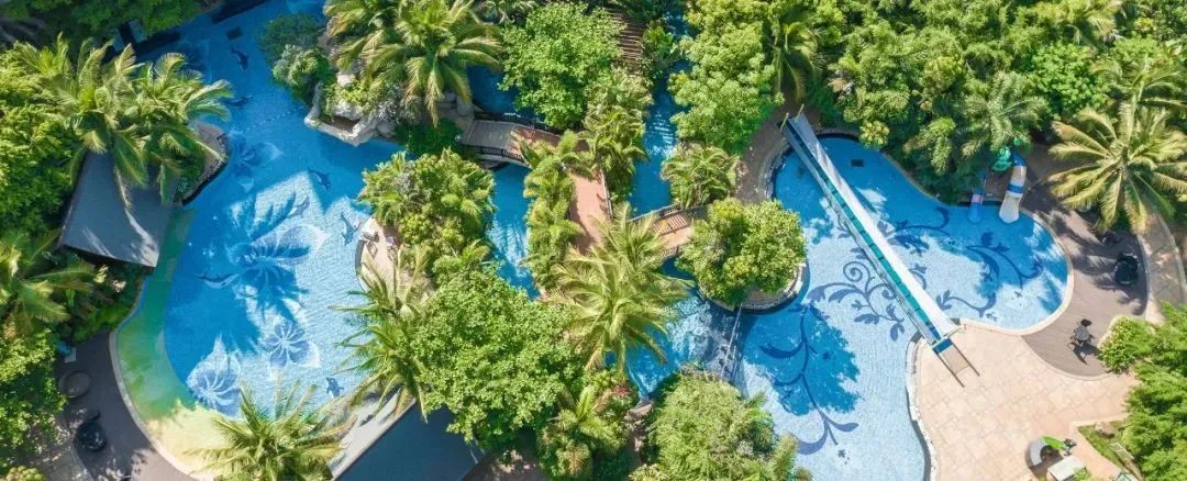 套餐内容有:豪华花园房1间1晚,含次日2大2小自助早餐(1.2米以下),提前3天预约视房态升级至奢丽海景房,尊享海岛国风童乐营亲子活动及小小饲养家1份,CDF海南离岛免税代金券3888元,海口免税城穿梭巴士,100元滴滴折扣券1份,畅享酒店生态泳池、天然温泉等。