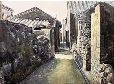跟着卢士刚的脚步,一幅幅展品看过去,他向海南日报记者举例:比如你从画中的老城墙和门洞体会到的是岁月沧桑;一所画着小狗的庭院让你感到温馨和安宁,从一幅骑楼街景的描绘里你看到繁荣和生机,当你从林木掩映中发现一所老宅,但感染你的可能是那无息的静谧。