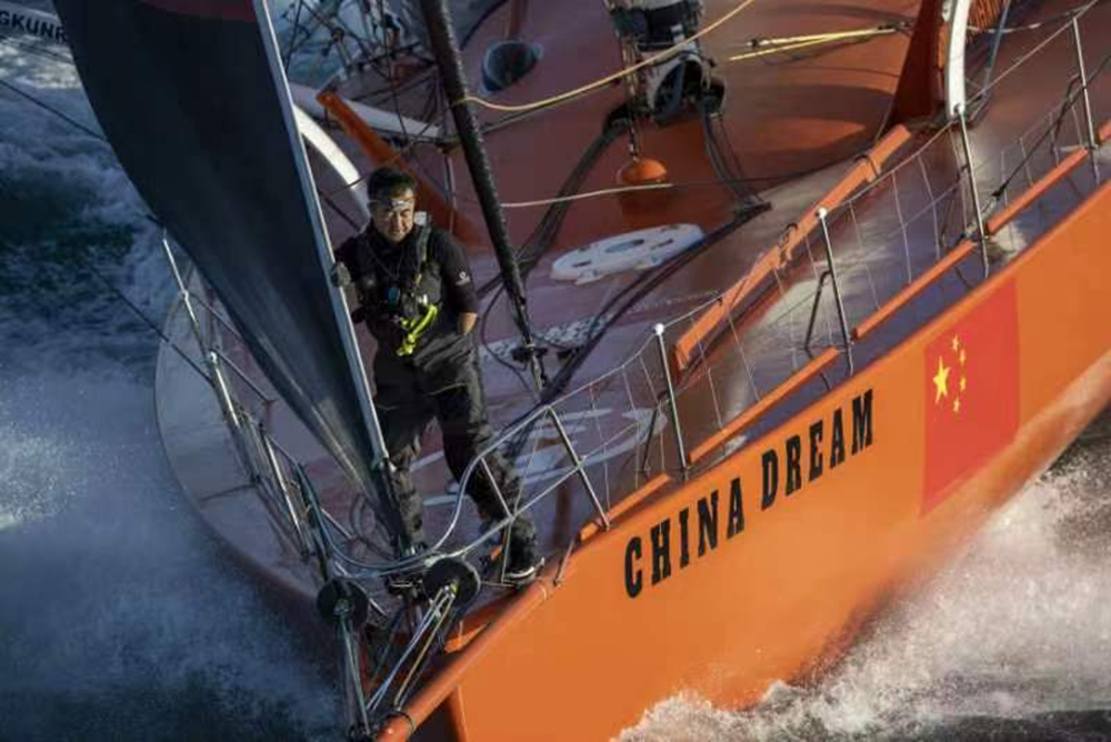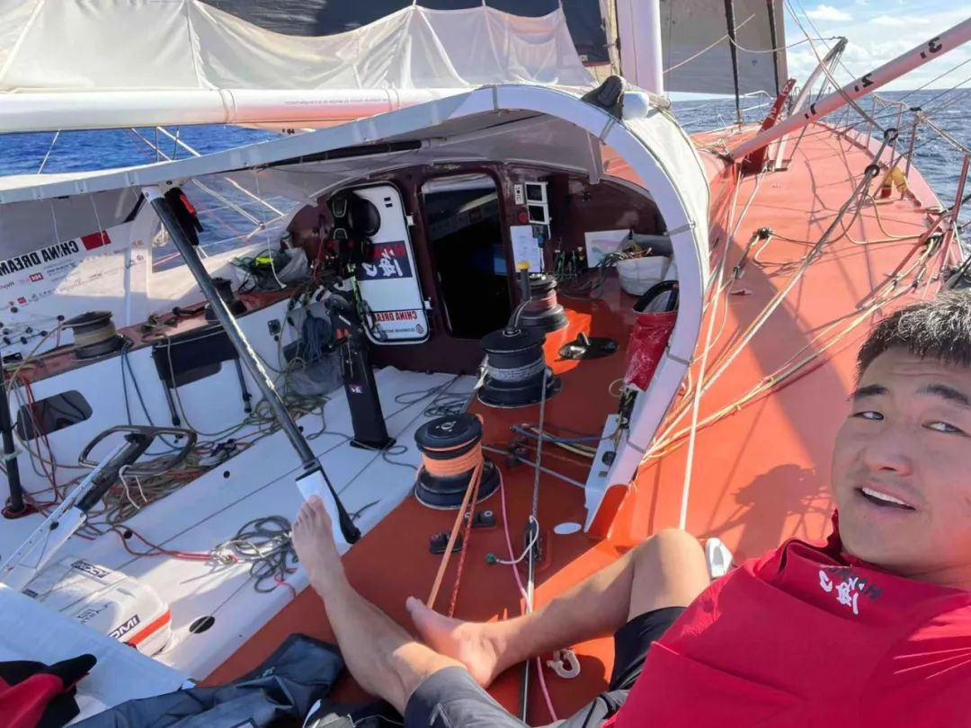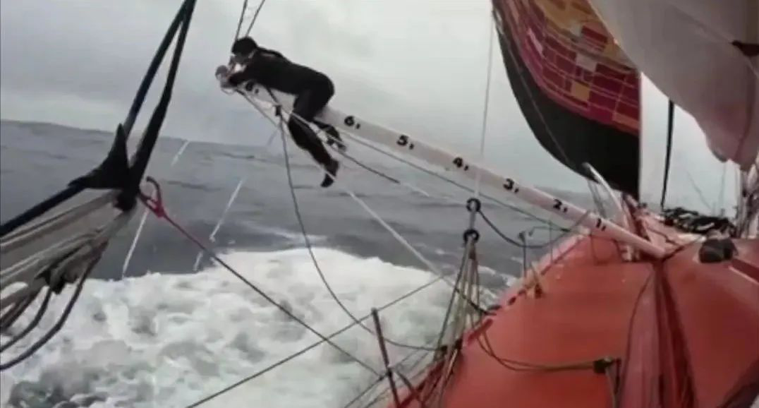 徐京坤准备从船舱里拿出久未露面的大三角帆,让自己的赛船在大西洋的高速路上飞翔起来。而在此之前,他不得不爬上舷外撑臂去解决一个断裂索具的问题,在高速行驶的赛船上保持平衡单手完成操作,这并非易事。