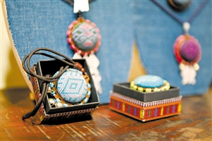 海口骑楼老街不仅有美食、展演活动,这里的文创产品也备受青睐。图为骑楼老街店面内销售的文创产品黎锦吊坠。 本报记者 石中华 摄