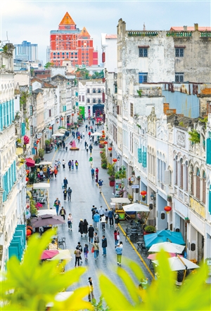 百年骑楼老街见证了海口一段发展历史,在这里不仅可以吃到老海口美食,还可细品老街文化。图为熙熙攘攘的海口骑楼老街。 本报记者 康登淋 摄