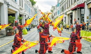 骑楼老街不仅有中式风格与欧亚建筑的南洋味道,而且还经常举办民俗展演活动。图为在骑楼老街中山路举行的“文化和自然遗产日”“非遗”展演活动。 本报记者 苏弼坤 摄
