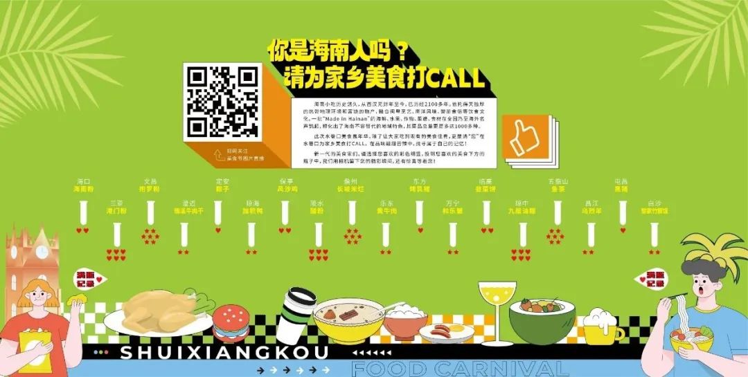 得益于得天独厚的地理环境和富饶的物产,海南独具特色、风味浓郁、品种丰富的美食,令无数市民游客垂涎三尺,流连忘返。为了充分展示海南美食文化特色,传播海南人气美食,让市民朋友们在水巷口就能吃到家乡的味道,特举办了为家乡美食打Call活动。海口海南粉、三亚港门粉、琼海加积鸭、定安粽、文昌鸡、陵水酸粉等,作为海南市县的美食代表出战,欢迎市民朋友们亲临现场,pick你最心仪的家乡美食,助阵家乡地道风味。