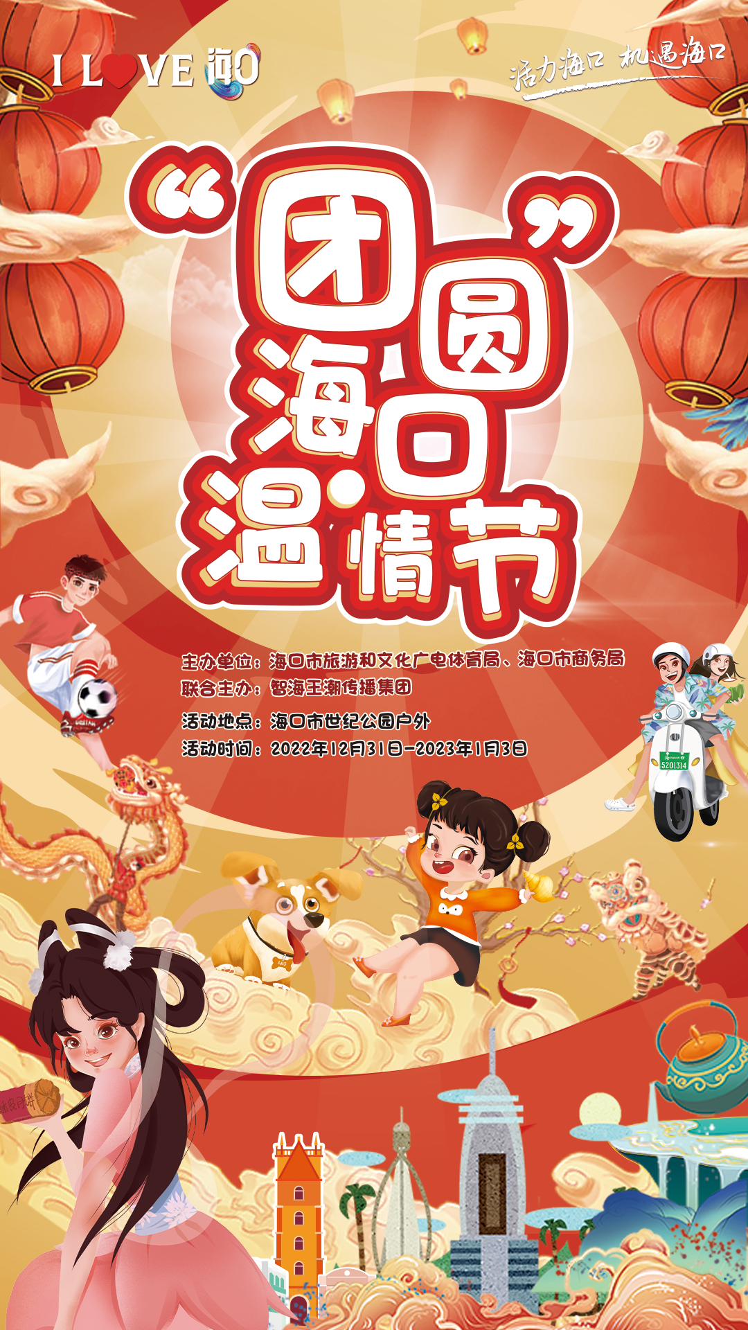 “团”圆海口·温情节2022年12月31日-2023年1月3日即将释放温暖活力。集结于上演一场属于海口全城的团圆,主题活动跨年狂欢盛筵团圆市集,引领潮趣生活方式新年街区感受跨年热闹氛围,人气街舞、主题音乐会、歌唱大赛,带来震撼感官体验,汉服秀、动漫cosplay,给你极致视觉享受。相约"团"圆海口·温情节让我们一起感受暖情时刻,携手走进2023!