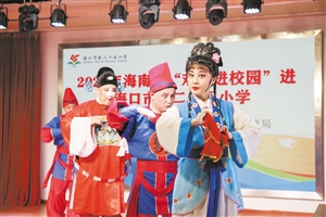 ▲市琼剧团为二十五小师生带来琼剧表演《春草闯堂》。 见习记者 孙士杰 摄