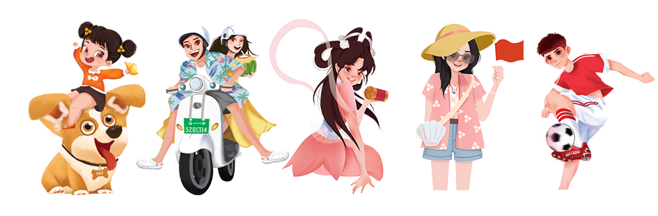 以阳光之城、浪漫之城、文化之城、时尚之城、活力之城作为基础元素,创设“我爱海口Z时代一族”系列潮流原创IP人物,塑造切合“我爱海口”品牌概念与核心价值的IP人物,以海南话音译的形式命名,阳光萌宝哆咪和他的爱宠AKO、时尚UP主情侣瓦瓦和鲁鲁、文化主播嗲嗲、潮牌主理人艾好、活力少年阿 X'iang。通过对宝宝、萌宠、时尚UP主情侣、网红主播、潮牌主理人、运动员等不同IP形象的个性化塑造,立体化的构建起新时代新海口人的美好生活面貌,从不同维度提升城市的视觉表达,弄潮海口时尚新生活,让海口领潮“出圈”,IP人物以各种奇思妙想、生活智慧锦囊的方式向走进海口城市生活,共同发现海口的城市温度。