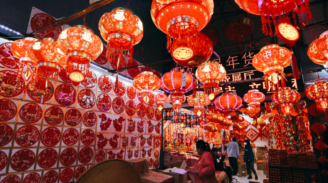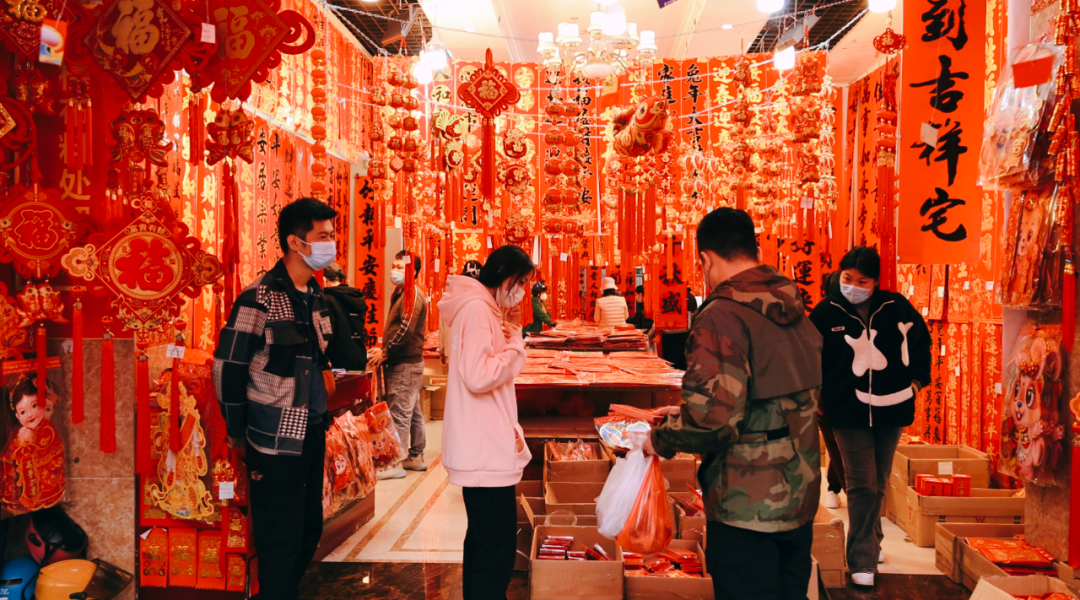 在博爱南年货市场,越往里走,年味越浓。灯笼、红包、对联、福字门贴是每家每户的‘必买品’,种类丰富,图案各异,价格亲民,市民游客可尽情挑选。