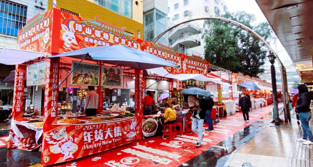 琼山区年货市集主场——忠介路步行街是一条古代与现代、海南文化与都市文明融于一体的商业老街。