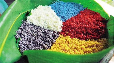 苗族五色饭是海南苗族制作的一种极富民族特色的食物,一饭五色,软糯清香。